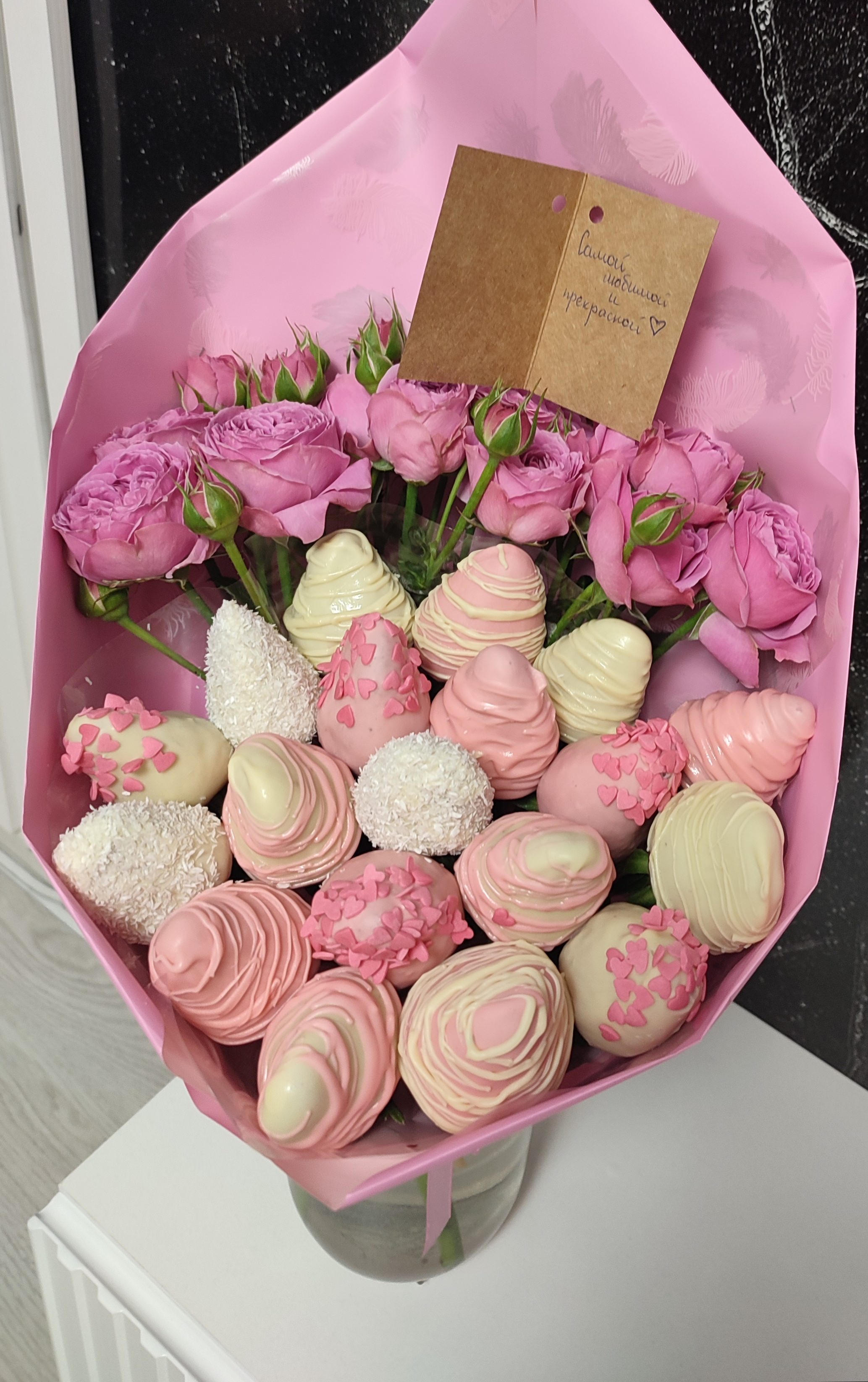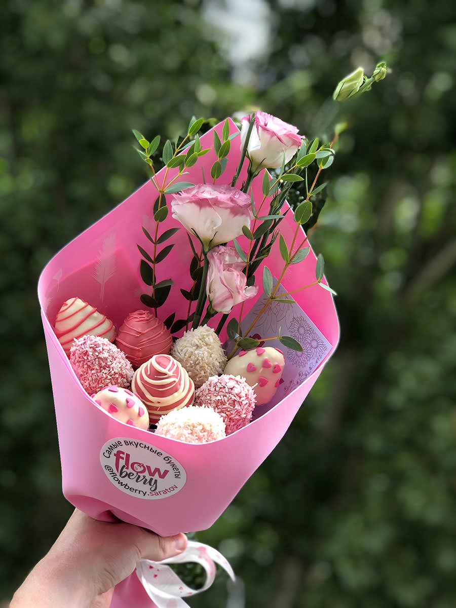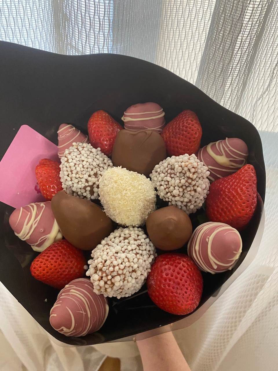 Аккуратно собранный букет из 9 клубник в шоколаде Callebaut и 1 веткой эустомы с добавлением зелени!